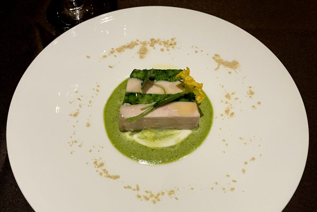 紀州うめどりの旨味と旬の菜の花を組み合わせたテリーヌに、和歌山県北山村特産の柑橘「じゃばら」を使った爽やかなソースを合わせた一品。
